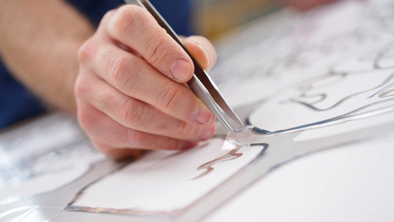 После завершения резки начинается этап постпечатной обработки. Выборка — это трудоемкий ручной процесс удаления лишних элементов пленки («облоя») с подложки. Этот этап требует аккуратности и внимания, особенно при работе с мелкими сложными деталями, выполняется с помощью специальных инструментов, таких как пинцет или крючок. Стоимость выборки обычно рассчитывается отдельно от стоимости услуги, зависит от сложности макета и объема ручного труда.