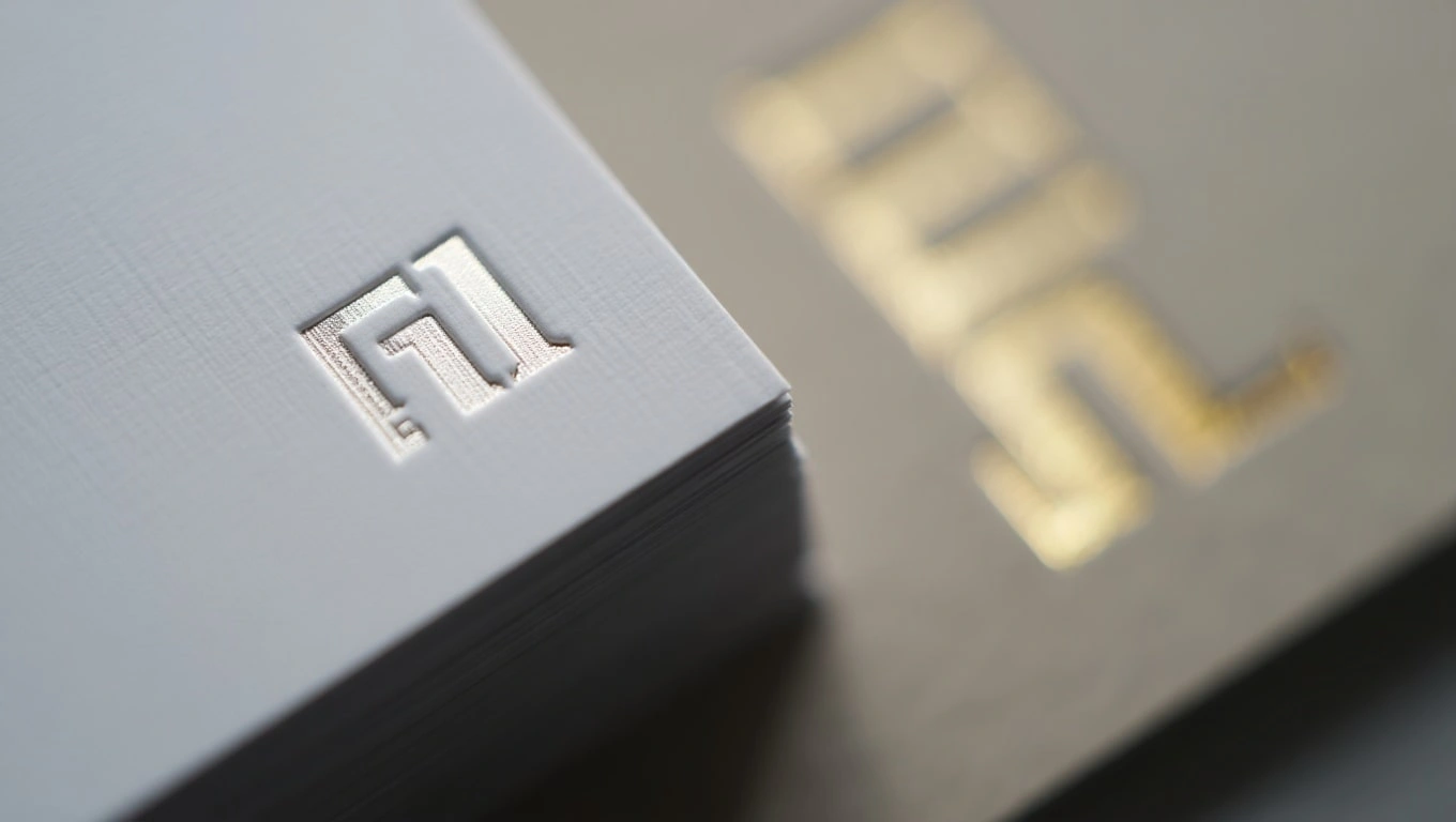 Для премиум-визиток идеально сочетание тактильных и визуальных эффектов. Оптимальный выбор — плотная дизайнерская бумага с покрытием Soft-touch (эффект бархата), дополненная элементами тиснения фольгой (например, золотой или серебряной) для логотипа и конгревным (рельефным) тиснением для названия компании.